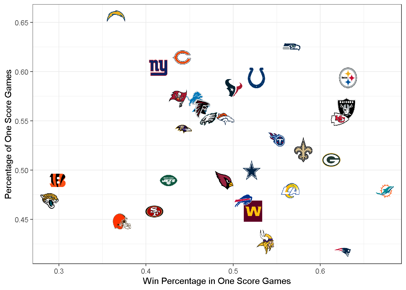labs(x = 'Win Percentage in One Score Games',